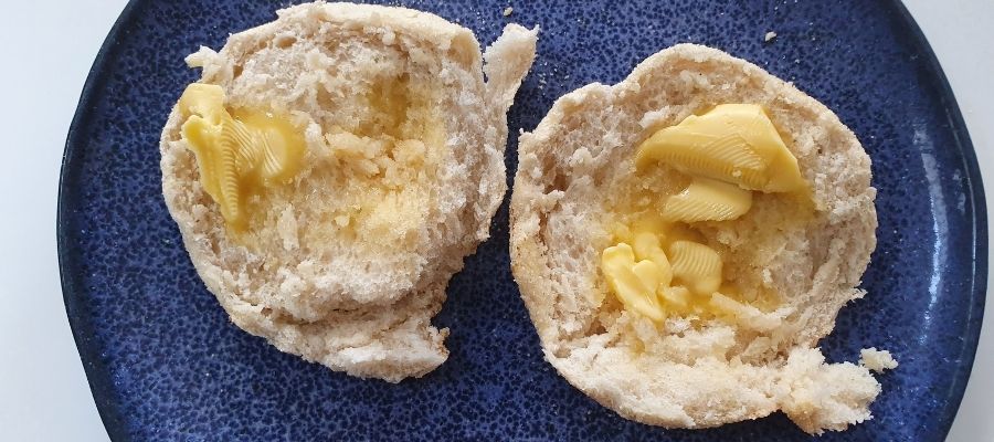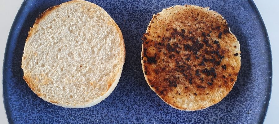 Below is an example of an English Muffin which I toasted in a pan, with and without butter. The muffin on the left was lightly toasted to warm through in a dry pan and the muffin side on right was buttered before toasting.